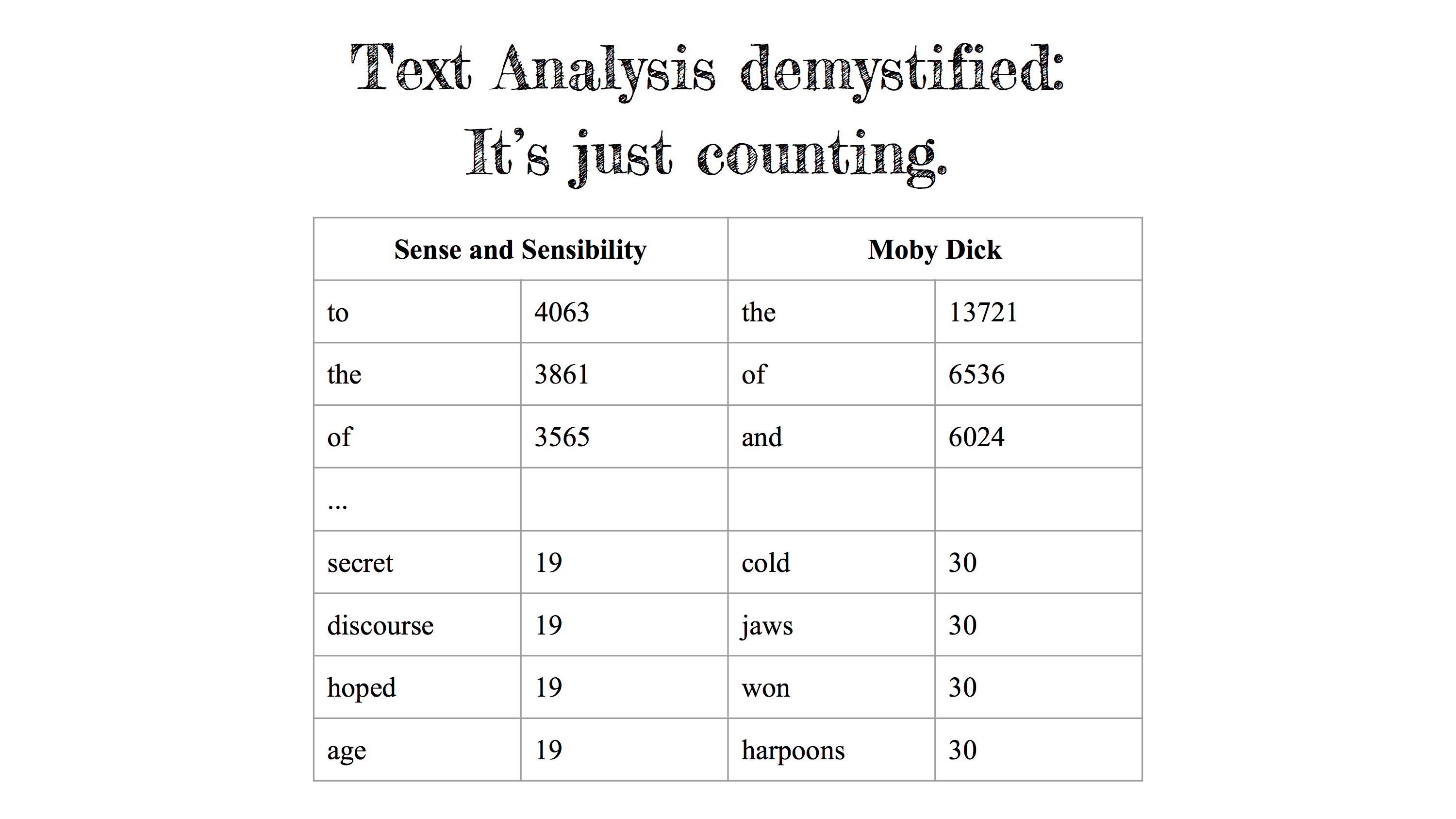 I have framed computer reading in this way before – simple counting and statistics – however I should apologize for misleading anyone, since that account gives the computer far too much credit. It might imply that the computer has an easy way to recognize useful strings of characters. (Or to know which statistical models to use for pattern-finding!) Let me be clear: the computer does not even know what constitutes a word or any linguistically meaningful element without direct instruction from a human programmer.