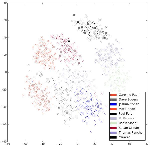 The style of “IG,” then, leans slightly toward non-fiction. That’s not entirely surprising, since the story is framed as a book’s preface. The fictitious book Iterating Grace is supposed to have been written (or rather compiled from Twitter) by Koons Crooks — an out-of-work programmer cum spiritualist. The “short story” we have examined is Iterating Grace‘s anonymous introduction describing what little we know about Crooks’ biography. Action is reported after-the-fact rather than ongoing; the story is centered on a single protagonist whom we don’t see interacting much with other characters; the narrator reflects periodically, trying to understand the motivations of the protagonist. This sounds like a New Yorker article. And if we interpret “IG” to lie within Orlean’s stylistic field in the PCA graph, it lies among the slices of her articles that lean toward fiction.