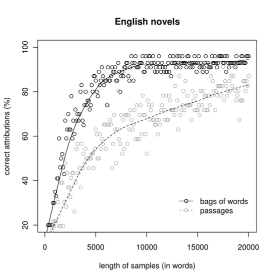 Accuracy increases overall as the size of textual samples increases, but there is an elbow around 5000 words where adding words to authors’ writing samples results in diminishing returns. Eder makes a thoughtful note about the nature of this accuracy: