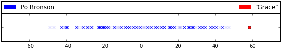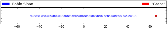 Taking the author’s style as a field circumscribed by so many slices of their text, “IG” lies fully outside of our visualization of that field for both Bronson and Sloan, and just within the periphery for Orlean. Another way to put it is that most of the slices of Orlean’s style are on average more similar to “IG” than they are to her most dissimilar slice. This is certainly not a resounding endorsement for her authorship of “IG,” but it helps us to understand where “IG” falls within her field. The story is just at the outer limit of what we would expect to see from her under normal circumstances. Should she reveal herself to be the true author of “IG” at some point in the future, we would know that it had been a stylistic stretch or an experiment for her. Should either Bronson or Sloan do the same, then we might be compelled to interpret IG as a stylistic break.