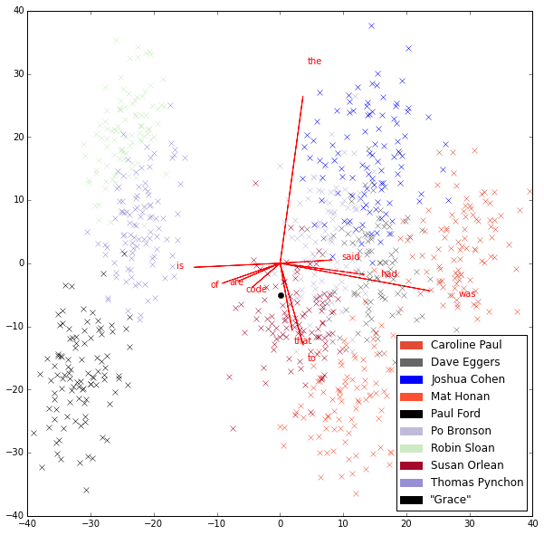 The phenomenon captured by the second principle component (the y-axis in Fig 2b.) is less obvious at first glance, but looking back over the texts included for the corpus, there is a clear division between fiction and non-fiction. Xs belonging to Ford, Honan, and Orlean tend to have more negative values. It is well known that author attribution methods are sensitive to genre, even among writings by the same author, so it is satisfying to have found that difference among texts without having made it an a priori assumption. In light of this, however, the loadings are all the more curious: the is a very strong indicator of fiction, whereas that and to construct the conceptual landscape of non-fiction reportage. Does this conform to our understanding of non-fiction as characterized by specification or causation? Or of fiction by the image?