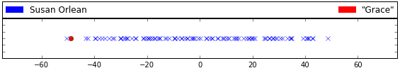 For the sake of comparison, I will show, along with Orlean, the authors who are the next most similar to and the most different from “IG” by this method, Po Bronson and Robin Sloan respectively.