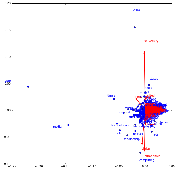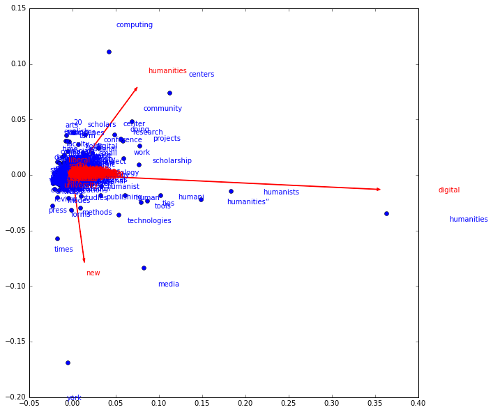 The above visualization was produced using the first two principle components of the context space and projecting the keywords into it. The red arrows represent the loadings, or important context words, and the blue dots represent the keywords which they contextualize. Blue dots that appear near one another can be thought to have relatively similar contexts in Debates.