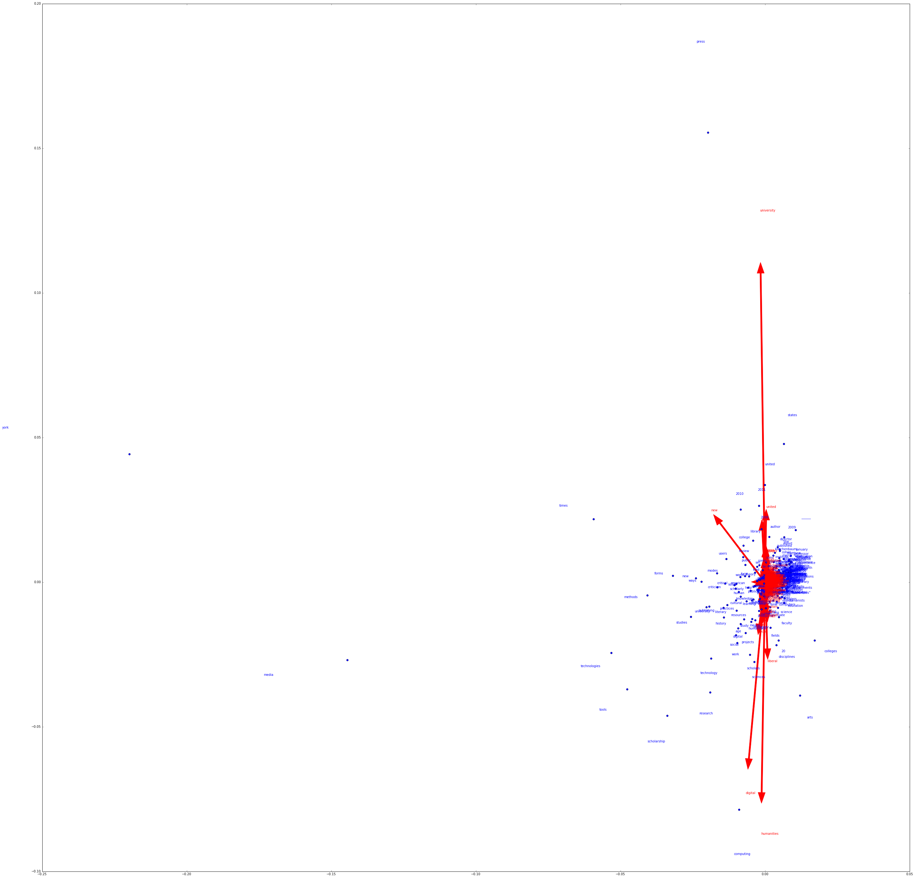Figure 3. PCA over 300 most frequent keywords and their contexts in Debates in the Digital Humanities, where tokens belonging to the bi-gram “digital humanities” have been excluded during pre-processing. (Click for larger image.)