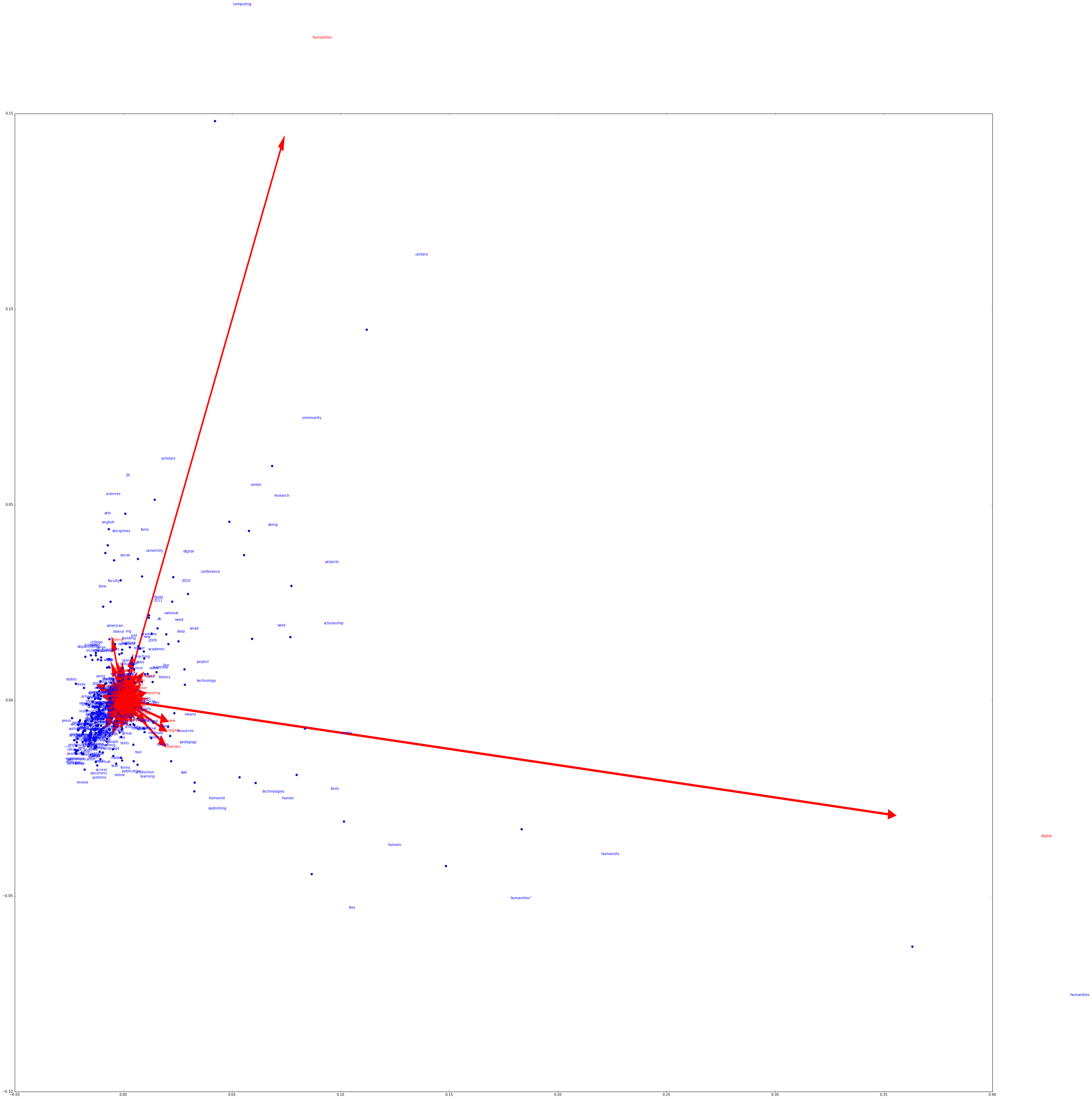 The above visualization was produced using the first two principle components of the context space and projecting the keywords into it. The red arrows represent the loadings, or important context words, and the blue dots represent the keywords which they contextualize. Blue dots that appear near one another can be thought to have relatively similar contexts in Debates.